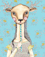 Drawing inspiration from the 19th and early 20th centuries, Marmee Craft's dreamy paintings and prints reflect a delightful world where animals and humans truly exist as equals, and happily share tea, wings and antlers. I’m not an impulse buyer, but within mere seconds of laying eyes on the lovely blue Fawn Mask print at right, it was mine. There are dozens of charming characters to fall in love with, but if you can’t decide there's a hand-sewn pouch of eight buttons with mini versions of the paintings.Gems and Findings
